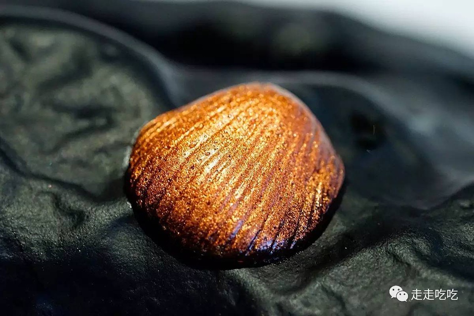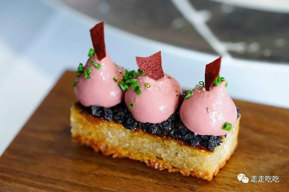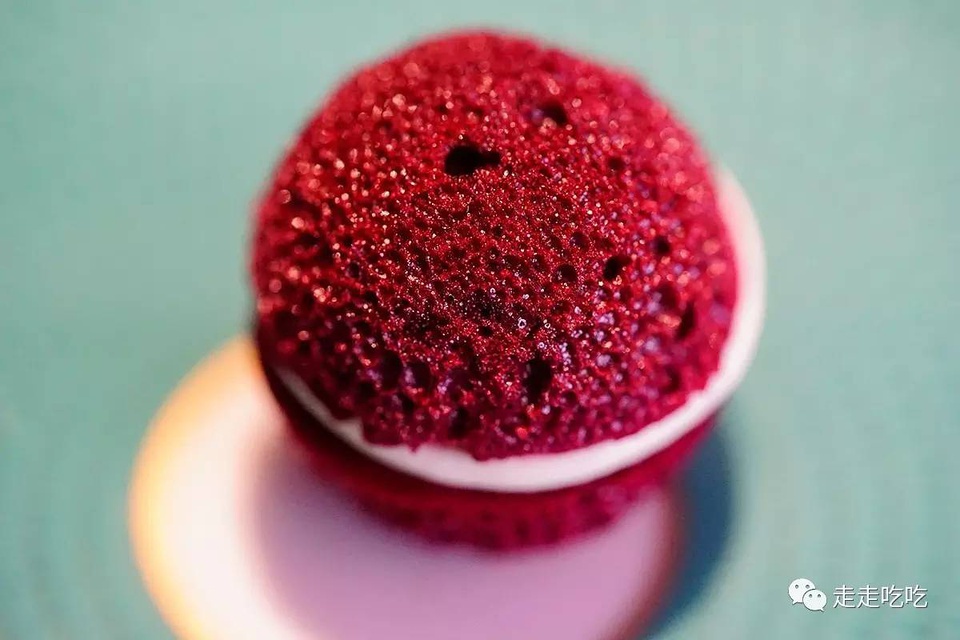 随后是一颗很像杨梅的甜菜根马卡龙,夹心是辣根做的。脱水气孔化处理的甜菜根没有了令人讨厌的泥土味,配合辣根给人新的体验。