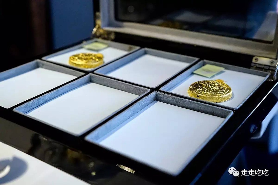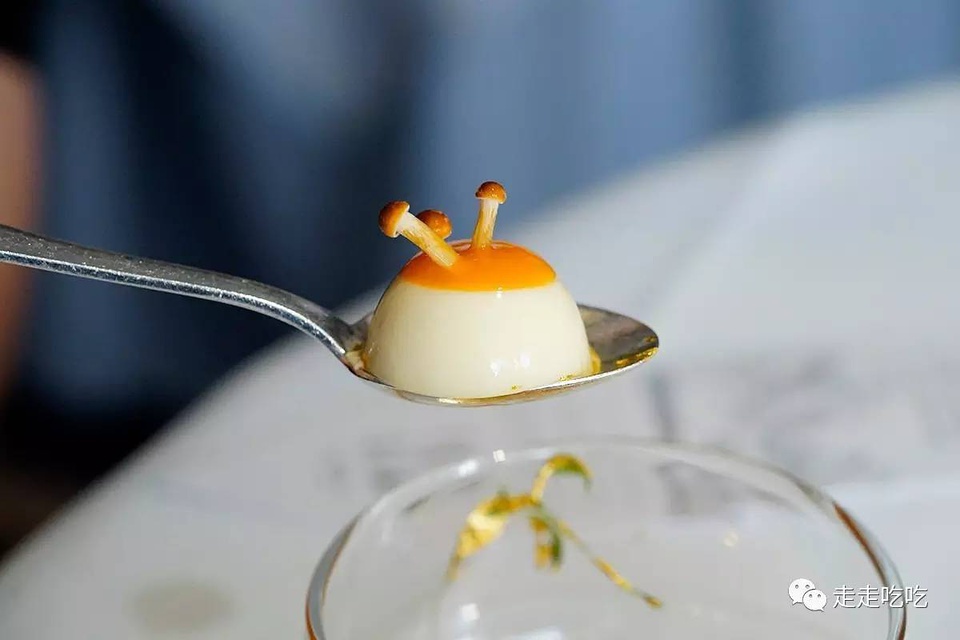 服务员让我们挑选一块“金币”放入茶壶中,这金币其实是浓缩脱水的牛肉汤裹了金箔,遇水便化开了,与壶中的鸡蛋、菌类融为一体。一碗Heston风格的“假乌龟汤”便完成了。牛肉的香气很重,汤味则较为清淡。