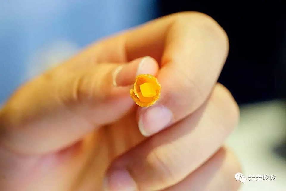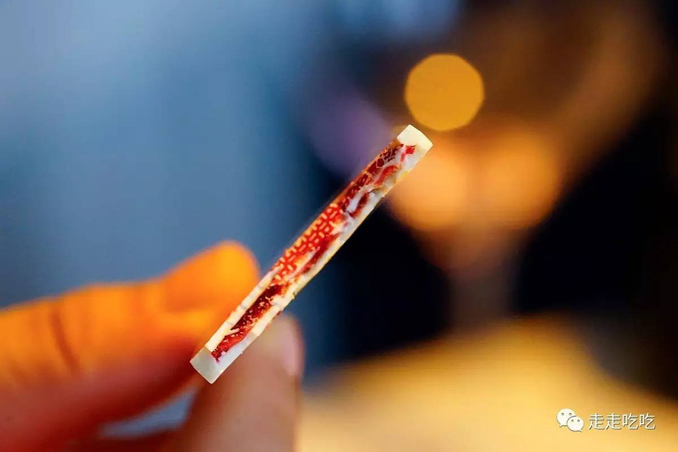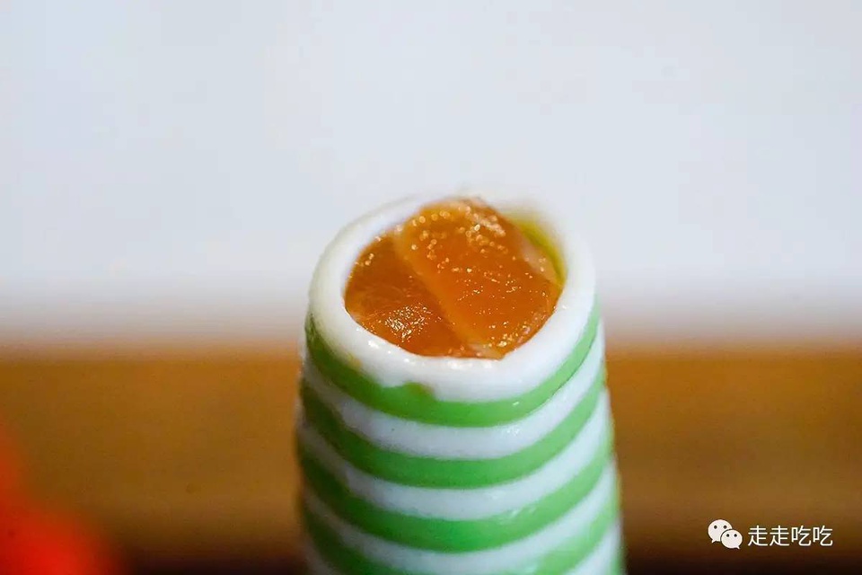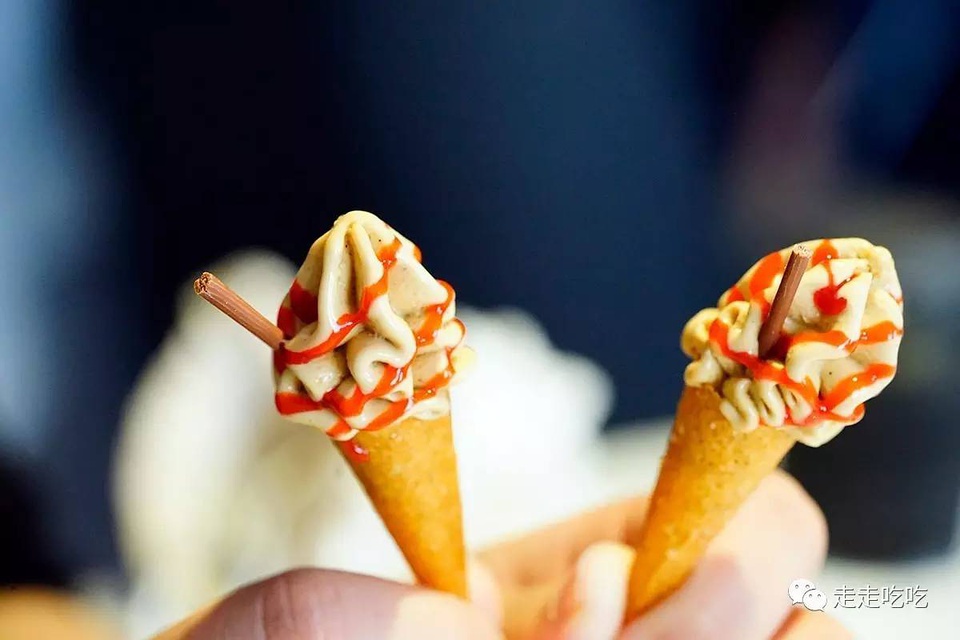 第三个小吃是蟹肉红辣椒冰淇淋,冰淇淋状的蟹肉伴着淡淡的辣味,给人一种奇妙的体验。麻雀虽小,五脏俱全,咬开蛋筒后发现里面竟然还有百香果果冻粒,起到增香去腥的作用。