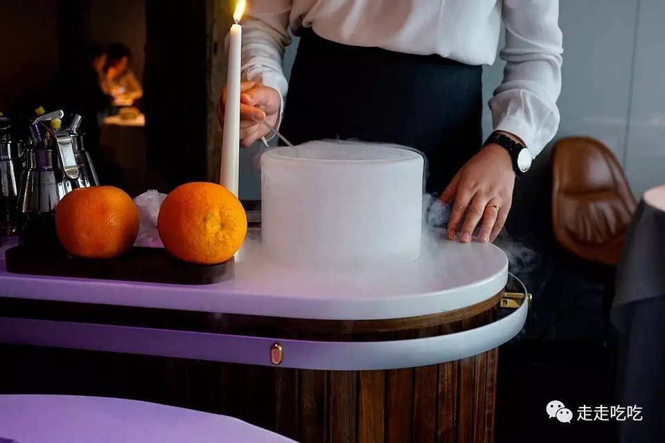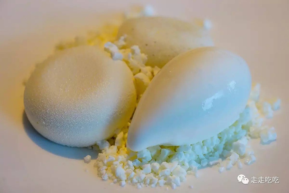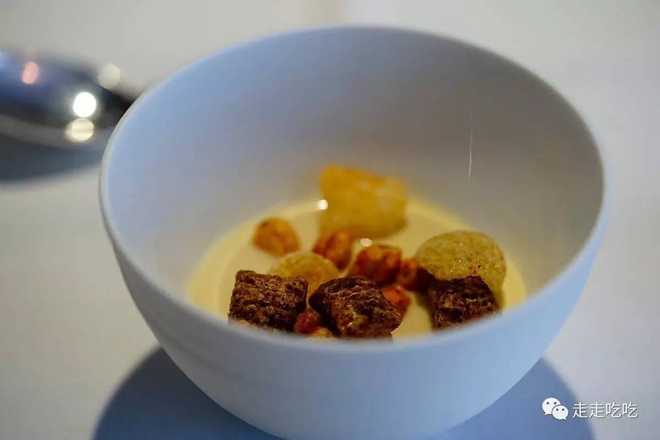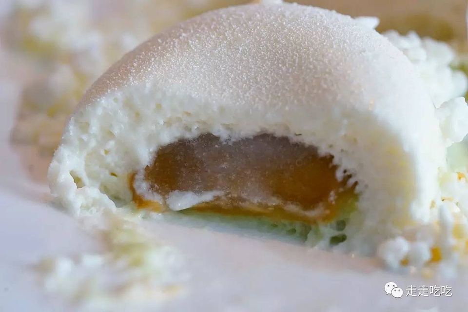 首先吃甜品的勺子用婴儿痱子粉拍包裹,粉拍透出清香的痱子粉味道。而甜品本身便是主厨与团队分析了痱子粉的主要原料后研发而成的。这道甜品可谓脱胎于婴儿痱子粉,里面的原料大部分都可以在痱子粉中找到。譬如香橙花、熏草豆(tonka bean)、芫荽等等,除此之外自然还有麦芽、透明化白巧克力、开心果、牛奶及调和蛋白(meringue)等等。因此除了浓浓的奶香和蛋白味道外,这道甜品还有复杂的香料味道,那些味道是淡淡的,似有还无的,却是不可缺少的一笔。而调和蛋白的性质也做得好像痱子粉拍似的,一咬开,里面是伯爵茶味道的馅……