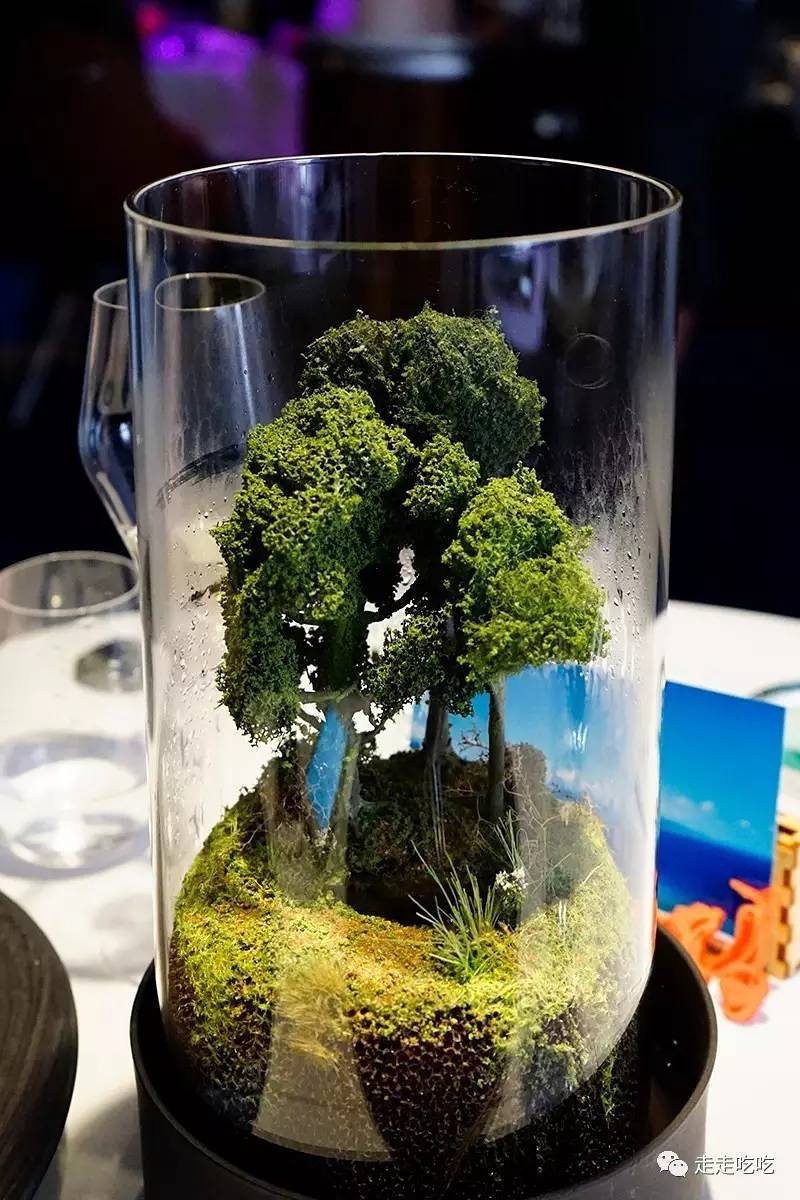 菜单的时间推移到第四部分——下午,这一部分的主题是关于山野丛林的。首先上来的是干冰雾气滚滚的玻璃圆筒,雾气下去后才看清原来是个树林模型,而且大树底下还有一个树洞,熟悉《爱丽丝漫游奇境记》的食客自然会心大笑,这不就是爱丽丝跌下去的无底洞吗?而随后上桌的菜品看上去也好像一段枯树,在丛林的泥土里腐朽,旁边还有脱水的米虫……第一眼看实在令人没有食欲。