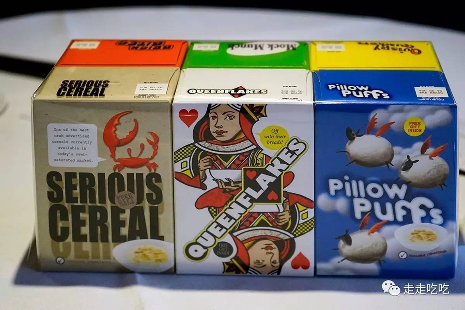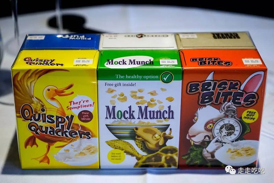 扮演“早餐”部分是伪装成传统小盒燕麦脆片/玉米脆片的混合脆片。包装盒上的图案都与餐厅主题有关,既有鸭子,也有《爱丽丝漫游奇境记》里的兔子、红心皇后及假海龟(mock turtle);盒子上还有许多有趣的细节,比如搞怪的配料表等等。