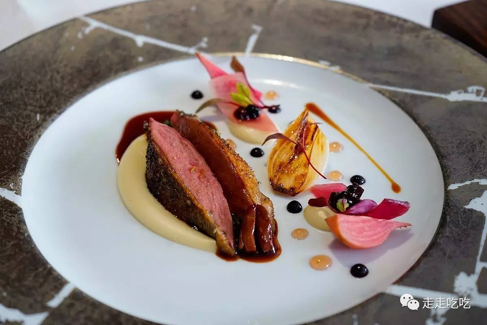 “主菜”是安茹(Anjou,法国旧制行省,大致对应目前的曼恩-卢瓦尔省)鸽子配甜菜根,以蓝莓酱调味,洋葱增香,半颗鸽心悚然立在边上……配菜则是鹅肝芭菲,以黄油煎脆的酸面包铺底。鸽肉非常鲜嫩,调味虽然依旧是传统的甜味,但相对清淡,甜味没有喧宾夺主。而晚秋至冬季是甜菜的季节,它又一次出现了……
