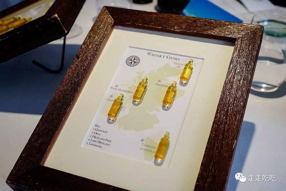 第五部分最有趣的是“餐后酒”里的威士忌口香糖,它将五个著名威士忌产地的不同年份威士忌做成了口香糖形式,酒的含量很少,但依旧可以品尝五种威士忌不同的风味。这也是胖鸭子的著名菜品之一。