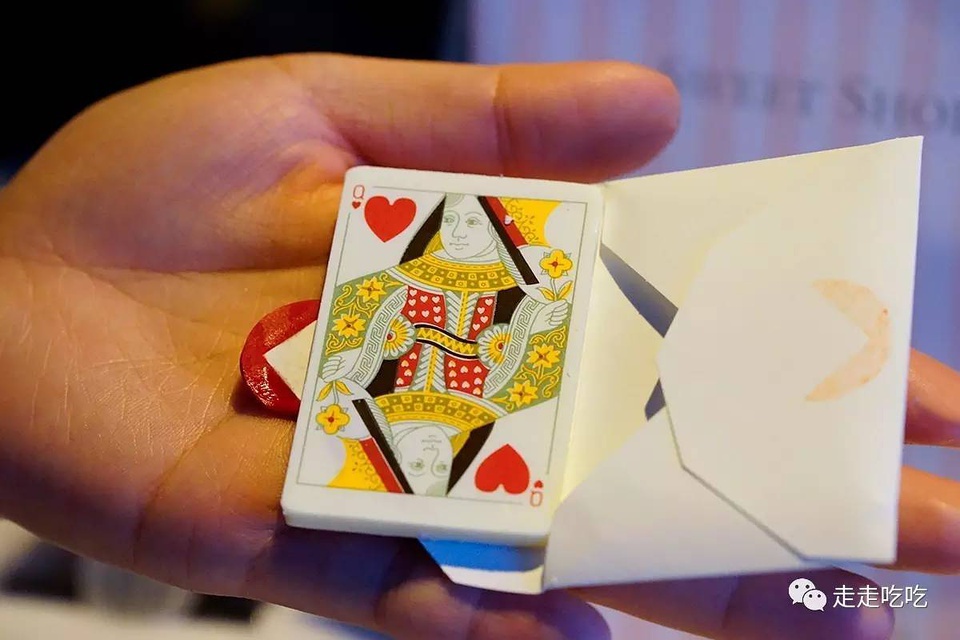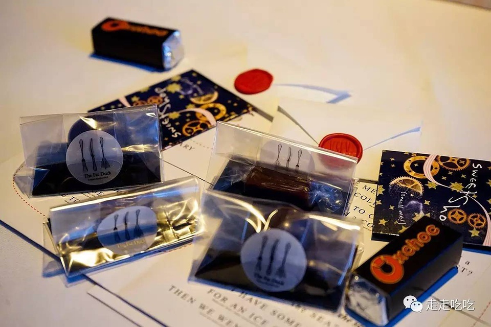 糖果一共有四种,和牛巧克力(oxchoc),可食用包装纸装的焦糖,红心皇后果酱挞,以及橘香气孔巧克力。最有趣的自然是薄薄的红心皇后果酱挞,看着是一张薄薄的扑克牌,一口咬下去里面还有果酱夹心。表层的巧克力拿久了便慢慢化开,拍照必须快速进行。