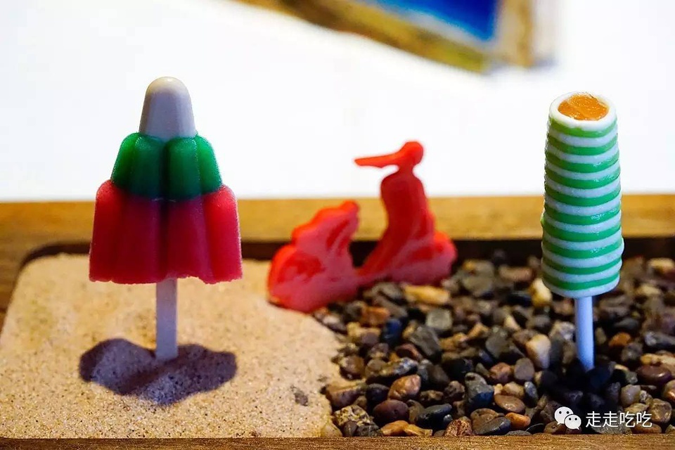 《海之声》过后是清口的三个小吃。彩色的海滩遮阳伞是冰砖,里面每一层口味都不同,从上而下是核桃、西芹及葡萄与红苹果的味道。绿白相间的就更为有趣了,外表是牛油果和辣根组成的,里面则是烟熏过的三文鱼。餐厅还特意做了一个塑料机车放在石子上,问卷中的每个细节似乎都融入了菜单中。
