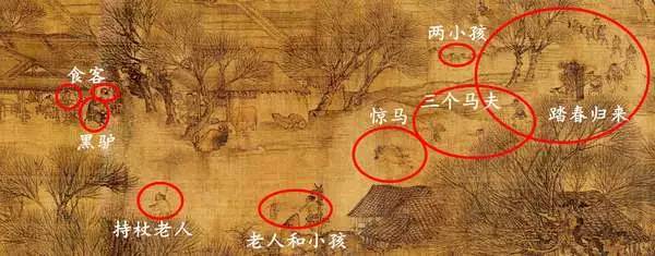 卷首,一群颇有声势的队伍踏青而来,后有马夫殿后。夫人坐在轿中,轿顶插满花草,官人坐于马上,中间是担着东西的轿夫。轿子后面的第一个仆人,身上担着打猎收获的两只野鸡,旁边墙上还趴着两小孩正在观望。
