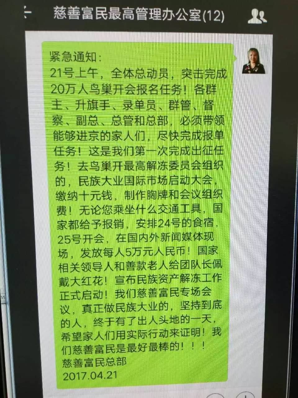 慈善富民总部发出的诈骗信息