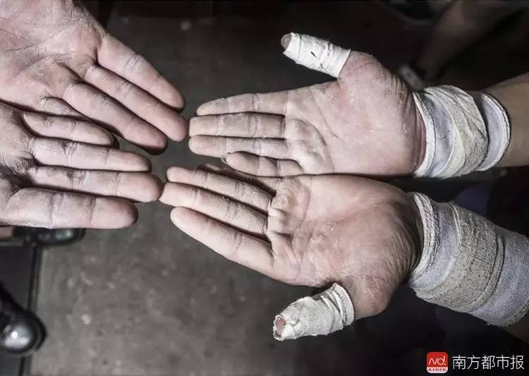 两个小运动员展示涂满镁粉的手掌,皮肤上全部都是长期摩擦产生的老茧,这是举重项目所要付出的代价。