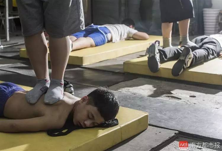 今年14岁的杨龙超在队员的帮助下训练,这样的场景在这里每天上演。来自云南的他,去年11月进入广东佛山高明区业余体校,爸妈在高明区杨和镇务工。