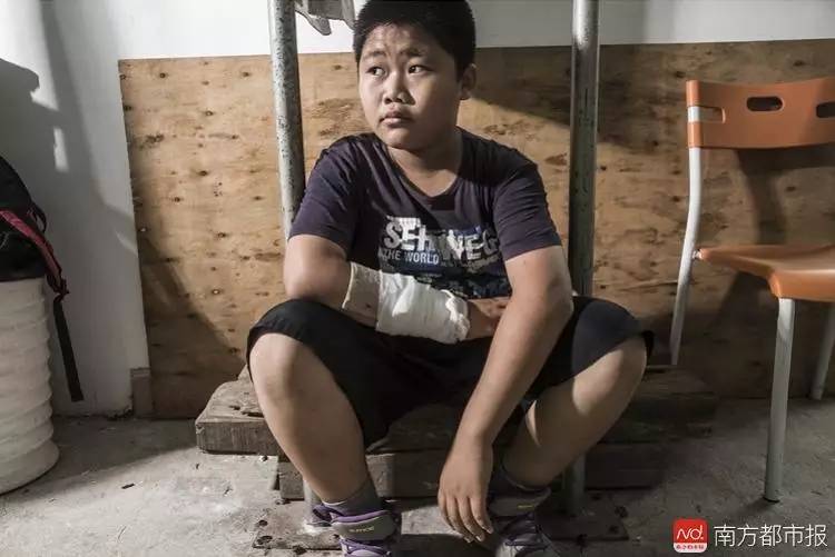 12岁的广西籍少年邱旺龙正在休息,他的手前几天因为摔倒受伤,目前只能做恢复性训练。父母在佛山市高明富湾务工的他,一直想通过自己的努力改变家庭命运。