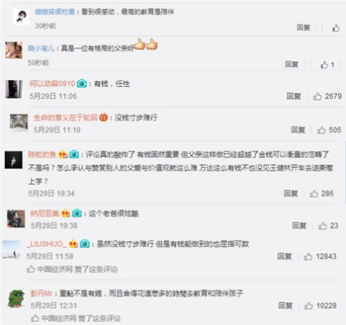 网友陈粒的鱼:有钱固然重要,但父亲这样做已经超越了金钱可以衡量的范畴了不是吗?怎么承认与赞赏别人的父爱与价值观就这么难。万达这么有钱不也没见王健林开车去送撕葱上学?