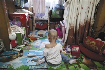 美美在家中独自玩,大多数时间因为担心感染,肿瘤儿童只是在家和医院度过童年。A14-A15版摄影/新京报记者侯少卿