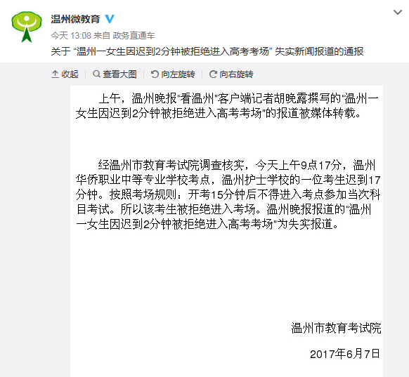 温州市教育局官方微博下午回应称,该考生迟到17分钟,按照规定,迟到15分钟不得进入考点参加当次科目考试。所以该考生被拒绝进入考场。之前网上所报道的迟到2分钟为失实报道。