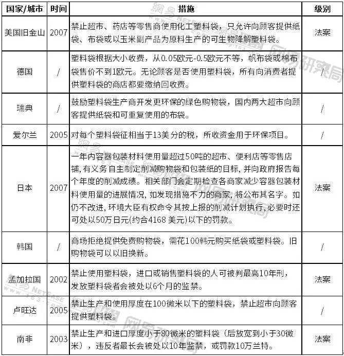 表2 各国“限塑令”(来源:《国外部分国家限制塑料袋使用的主要做法和经验》 制表:网易研究局