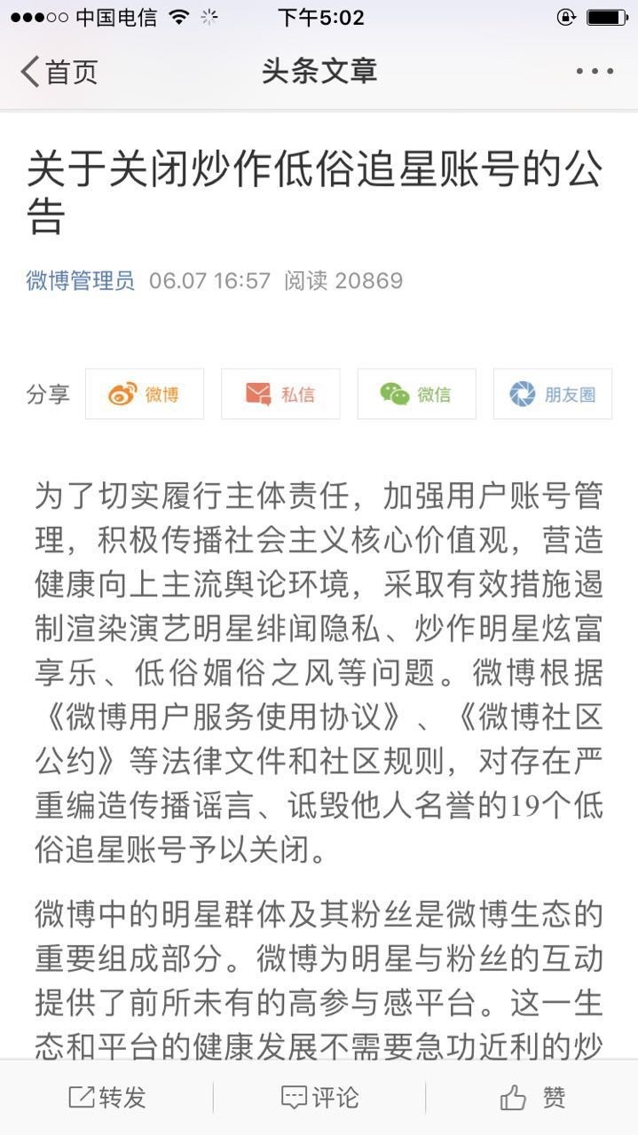 16时57分,@微博管理员 发布官方公告称:“根据《微博用户服务使用协议》、《微博社区公约》等法律文件和社区规则,对存在严重编造传播谣言、诋毁他人名誉的19个低俗追星账号予以关闭。”