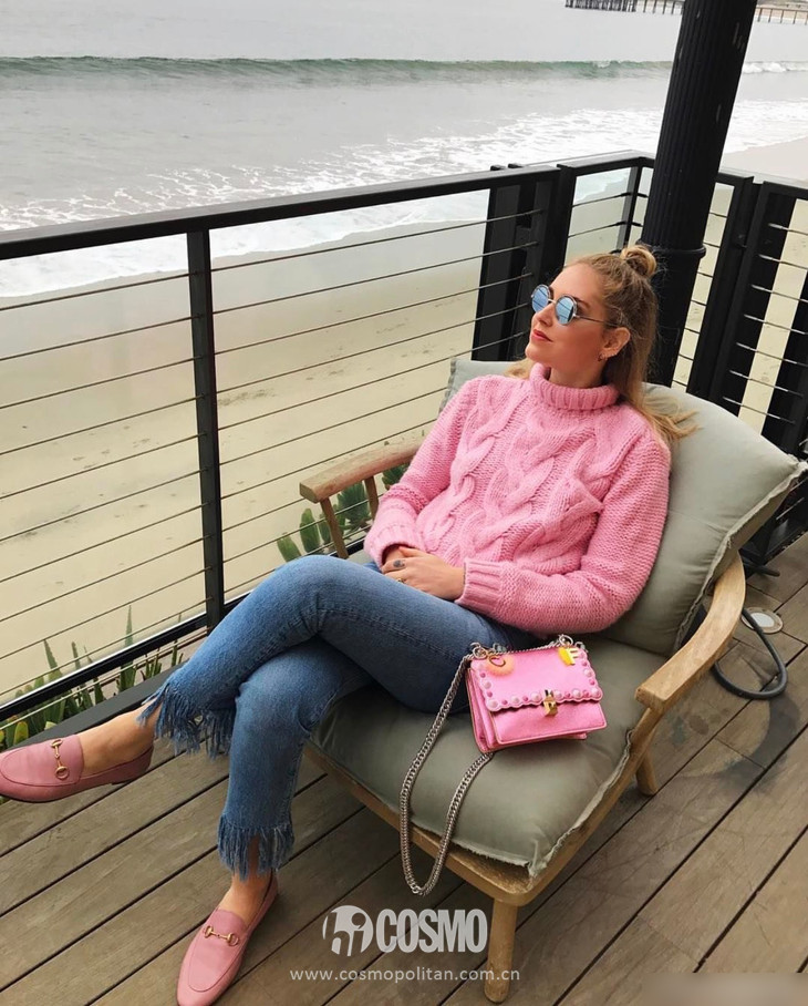 ▲Chiara Ferragni身着Ganni粉色毛衣