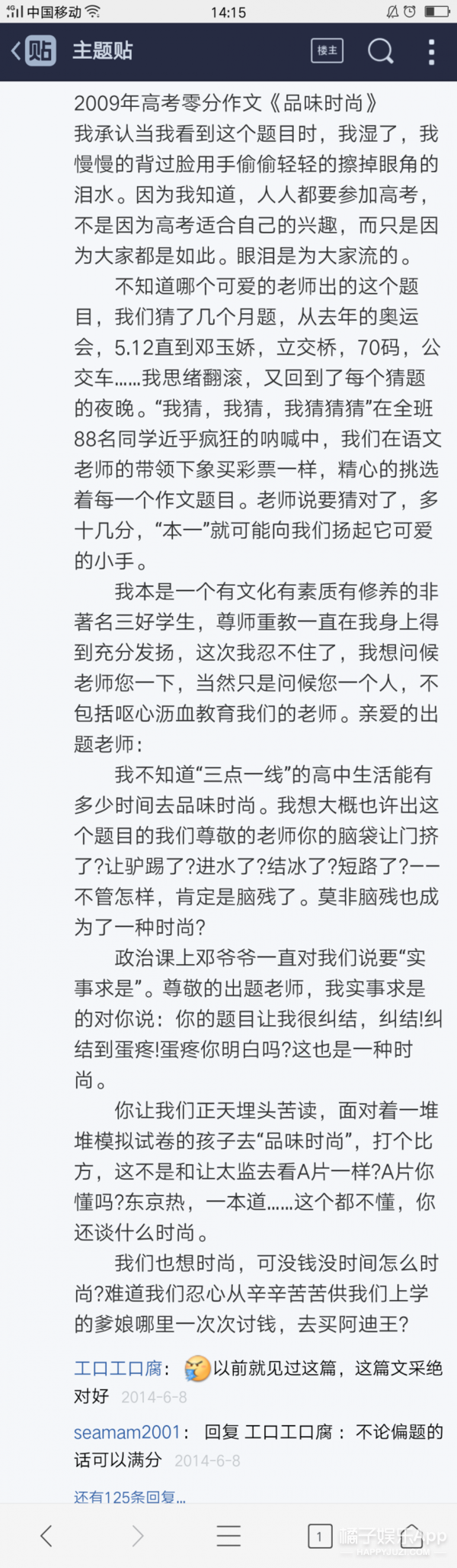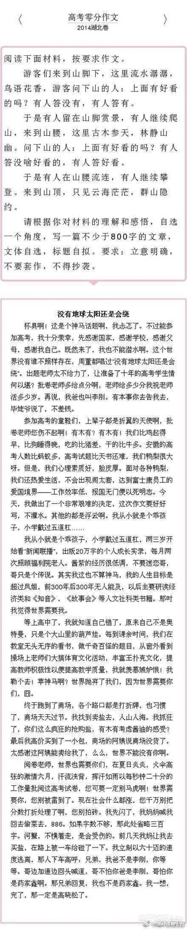2014年湖北卷,这位童鞋写了一篇获奖...感言?