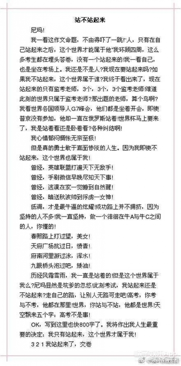 高考还未结束,一篇新鲜出炉的零分作文《站不站起来》就已爆红网络。