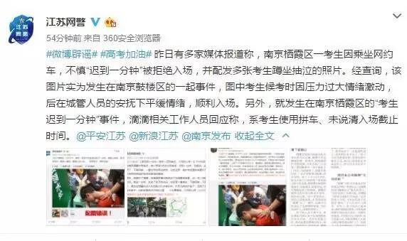 据媒体报道,6月8日下午3点,江苏高考英语开考,根据规定,所有考生须提前15分钟,也就是2点45分进场。在南京栖霞区栖霞中学考点,一名考生因2点46分赶到考场,被依规禁止进场。
