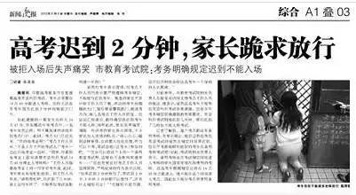 而类似高考迟到的新闻,几乎年年都有发生。例如2012年6月8日,在上海华东模范中学考点外,一名考生因为半道自行车坏了,虽然仅迟到2分钟,还是被工作人员拒绝入场。考点门前,母亲下跪苦苦哀求,心急的考生还一度做出踢打铁门、翻墙入场的过激举动,而周边围观的家长也纷纷为他求情。