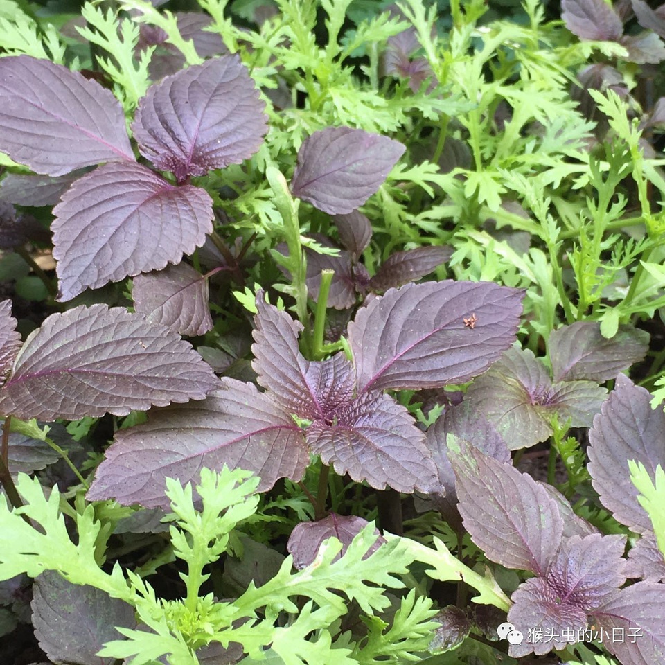 说到紫苏,并不是啥高大上的存在,平时我们生鱼片下面的那个绿色的大叶,就是绿紫苏。只不过我们家某一年中了几个赤紫苏后,秋天紫苏们疯狂的自我播种,接下来每年春天,都会有几百颗紫苏苗苗不请自来的出现在我们家的土里。