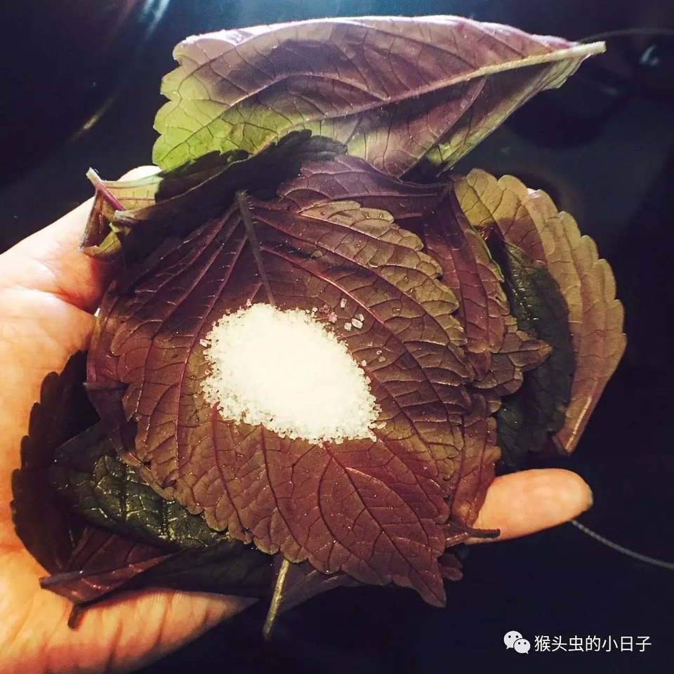反复这个动作,慢慢紫苏就会被你捏烂。汁水都会从手心慢慢溢出。