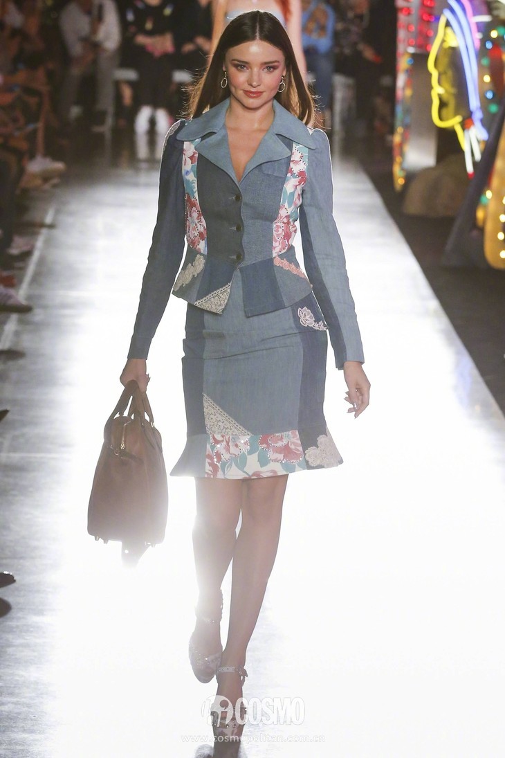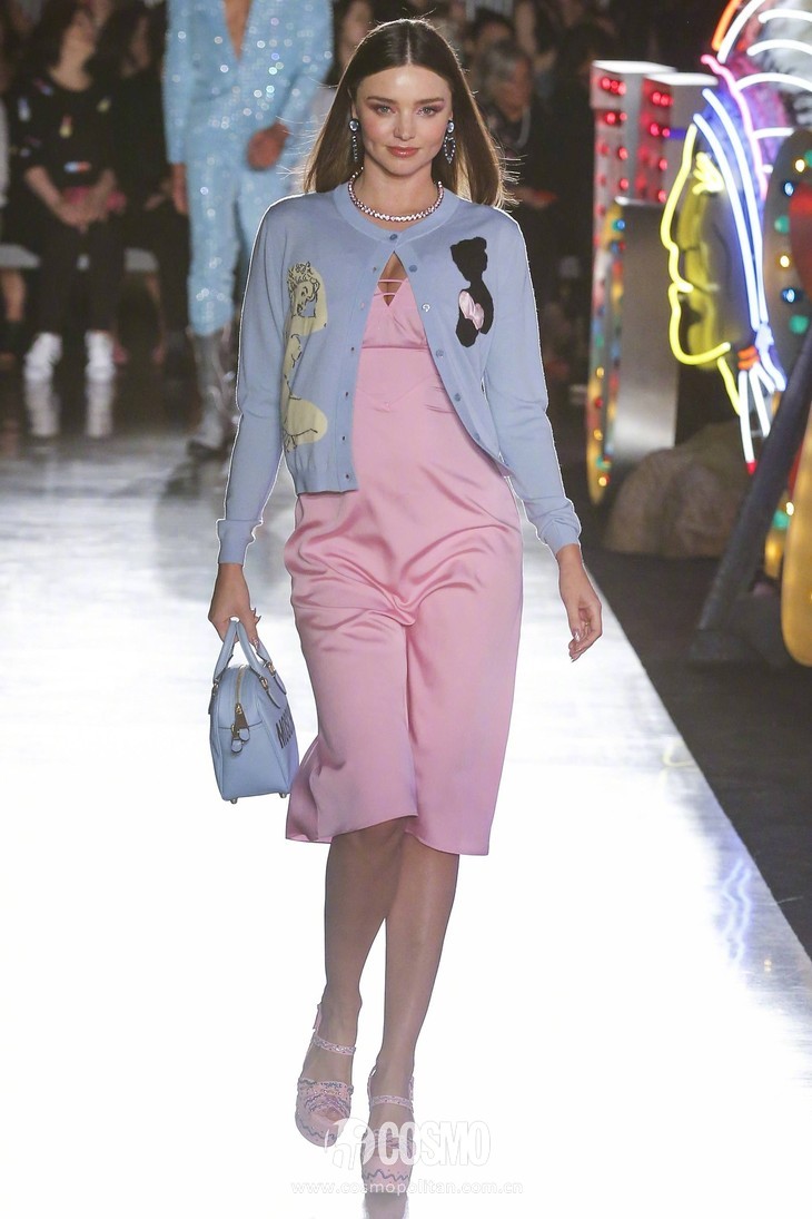 Moschino 2018早春度假系列发布,设计师从洛杉矶到拉斯维加斯的旅行中获得全新的灵感,牛仔、小城镇女孩,以及火焰制服、兔女郎制服都在这一季呈现。米兰达-可儿惊喜亮相秀场。