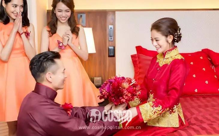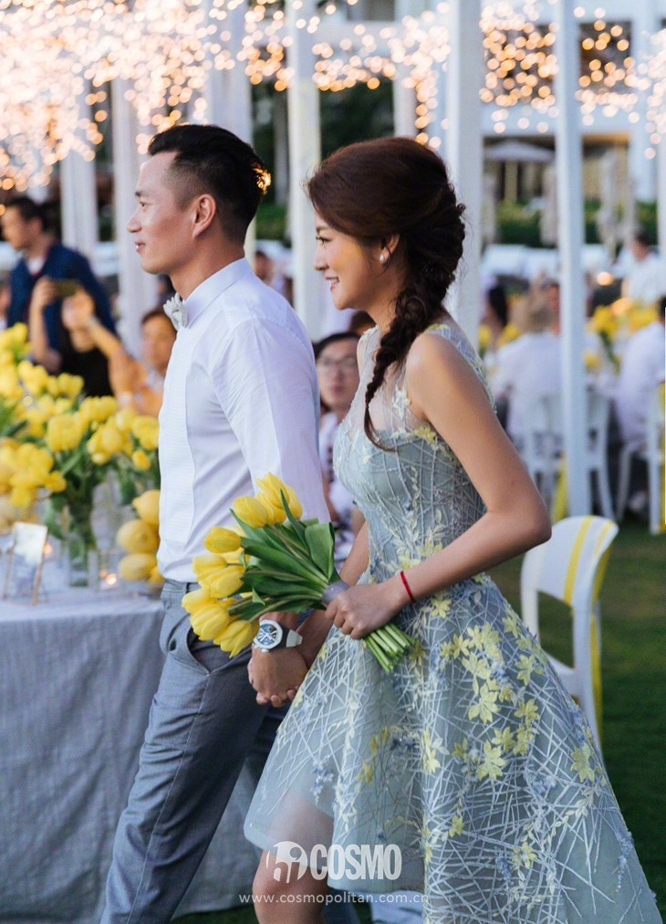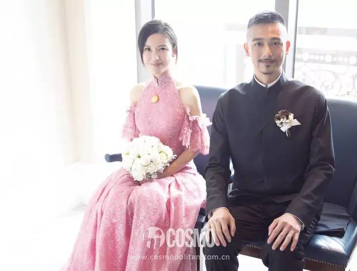 6月10日上午,“天姗”夫妇在台北举办婚礼,上午的迎娶仪式上,两人均穿夏姿-陈中式礼服,杨子姗选择粉色连衣裙搭配Jimmy Choo婚鞋,尽显甜美。晚上举行婚礼喜宴变换两套造型,包括一条Tony Ward蕾丝婚纱和一条抹胸婚纱。
