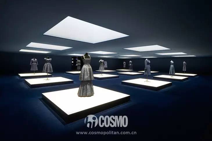 12件迪奥先生时代的典藏作品,从1949年首个迪奥高级订制女装系列“新风貌(New Look)”中的海军蓝羊毛修身大衣“多丽丝(Doris)”,到1957年秋冬高级订制系列带有玫瑰花图案的蓝色丝锦缎午后洋装“情书(Billet Doux)”,无不淋漓尽致地彰显了迪奥先生对蓝色的热爱。