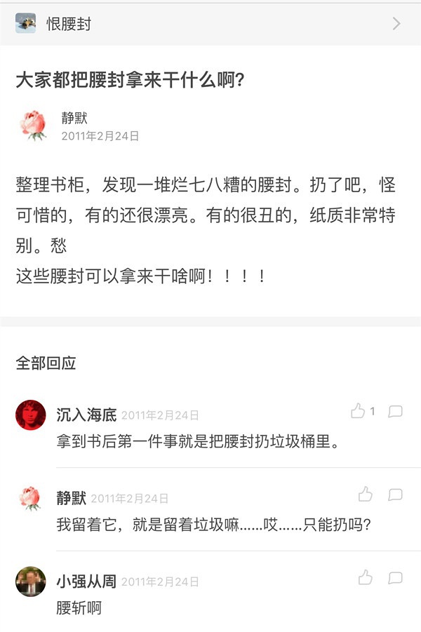 在豆瓣的“恨腰封”小组里,不少网友表达对腰封的不满:“讨厌一切松松垮垮的,可拆卸的,不结实的玩意儿”、“我买书基本都是网购,收到快递之后,第一件事就是扯掉腰封和独立书皮”、“是啊,非常之鸡肋,不知是扔掉好还是留着好,怒”。