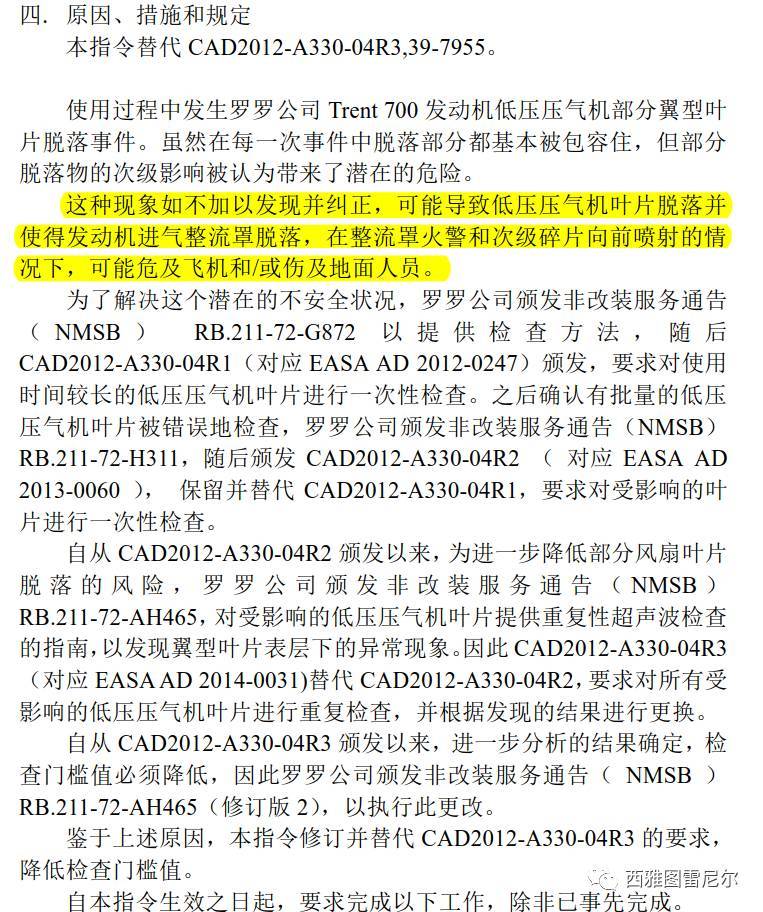 CAAC这个适航指令也指出,EASA在去年7月份也已经发布了相关的指令。
