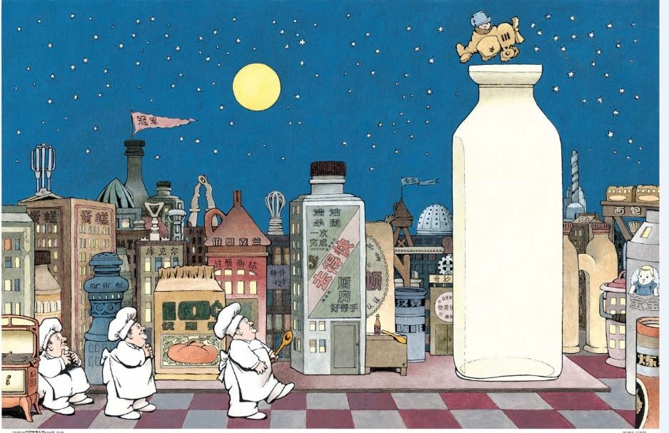 第二部书《午夜厨房》,他为什么创作这本书呢?必然因素是他整个童年经验里非常关注米奇,从小到大一直跟米奇在一起,米奇是他的偶像。这种想法在当时是很不寻常的,因为当时艺术界里还是波洛克是老大。在《午夜厨房》之前还有另一件事,《小尼莫梦乡游记》的漫画原画在美国大都会博物馆展出,促使有一帮人包括桑达克在内,他们认为插画也可以是很高级的。所以他在这本书中用了非常多的现代手法,用通俗的方式来展现。这本书用了很多童谣里的话,桑达克去琢磨很多童谣书,发现很多故事是关于吃的,他发现小孩子喜欢的东西都是跟味觉有关的东西,所以他把所有的集中起来要创作一本书。当然,他又用了一个光屁股的米奇,又引起了争议,到现在为止,这本书可能依然在美国图书馆协会的禁书名单上面。