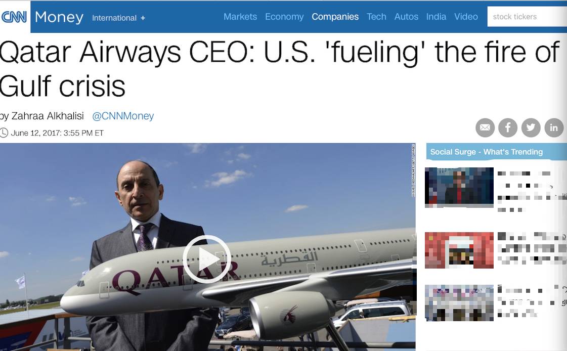 可是,面对目前的断交危机,卡塔尔航空的扩张计划面临重重困难。6月6日,特朗普在社交媒体上发布了两条似乎支持中东国家与卡塔尔断交的消息。对此,卡塔尔航空CEO Akbar Al Baker在接受CNN采访时表示:“我不想评论特朗普。我感到非常失望。”