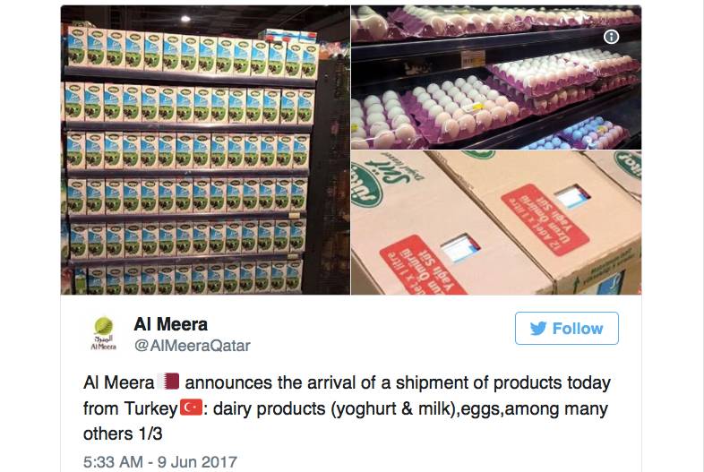 卡塔尔虽然拥有丰富的石油和天然气资源,但农牧产品不能自给。粮食、蔬菜、水果、肉蛋奶等主要依赖进口。2012年,《时代》杂志称卡塔尔90%的食品依赖进口。多国与其断交后,周边国家封锁了领空,让卡塔尔的飞机无法经过;与其接壤的邻国关闭了边境,把卡塔尔堵在了角落里,所以,食物是个大问题。刚断交后的两天,卡塔尔出现了超市食品被抢购一空的情况。