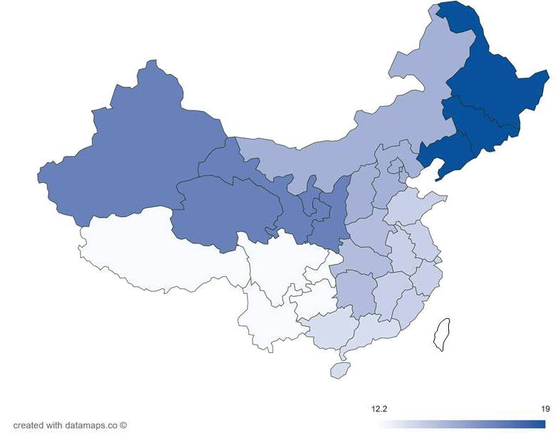 ▍中国各地区每十万人中因糖尿病死亡的人数