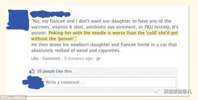 “不,我和我未婚妻不想让我们的女儿接种什么疫苗,维生素K,抗生素眼膏,还有小儿苯丙酮尿症测试。这些都是毒药。