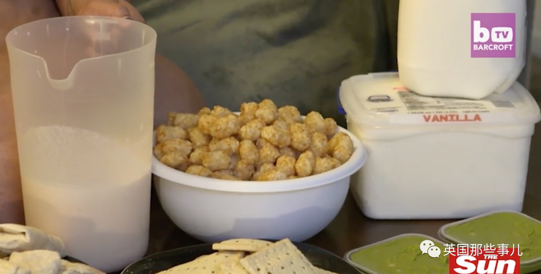 6个松饼,6个卷着面包吃的香肠,一大碗谷类早餐,两勺卡路里冲剂,4个麦当劳三明治,4个双层芝士汉堡,大份薯条,30个炸鸡块,干酪通心面,Taco Bell的食物,一加仑冰淇淋。