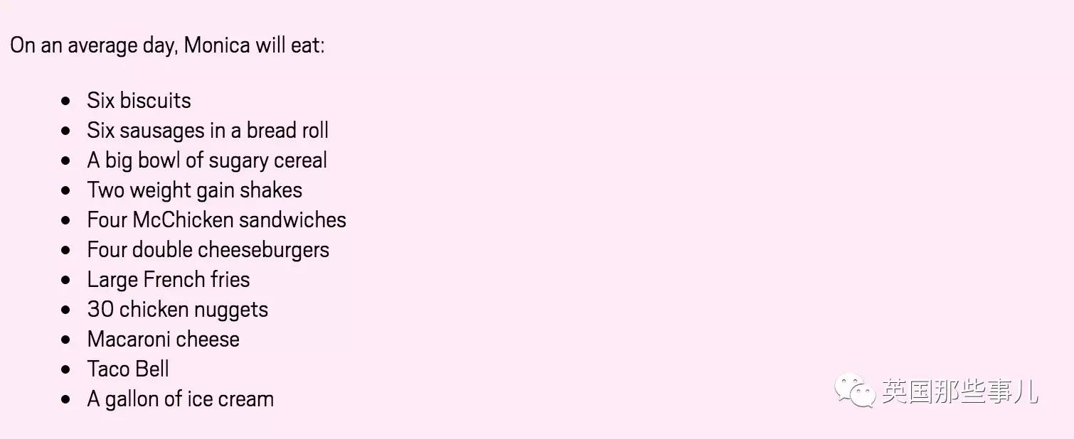 Monica的母亲曾经劝过她,过度肥胖非常危险,但她完全不听,