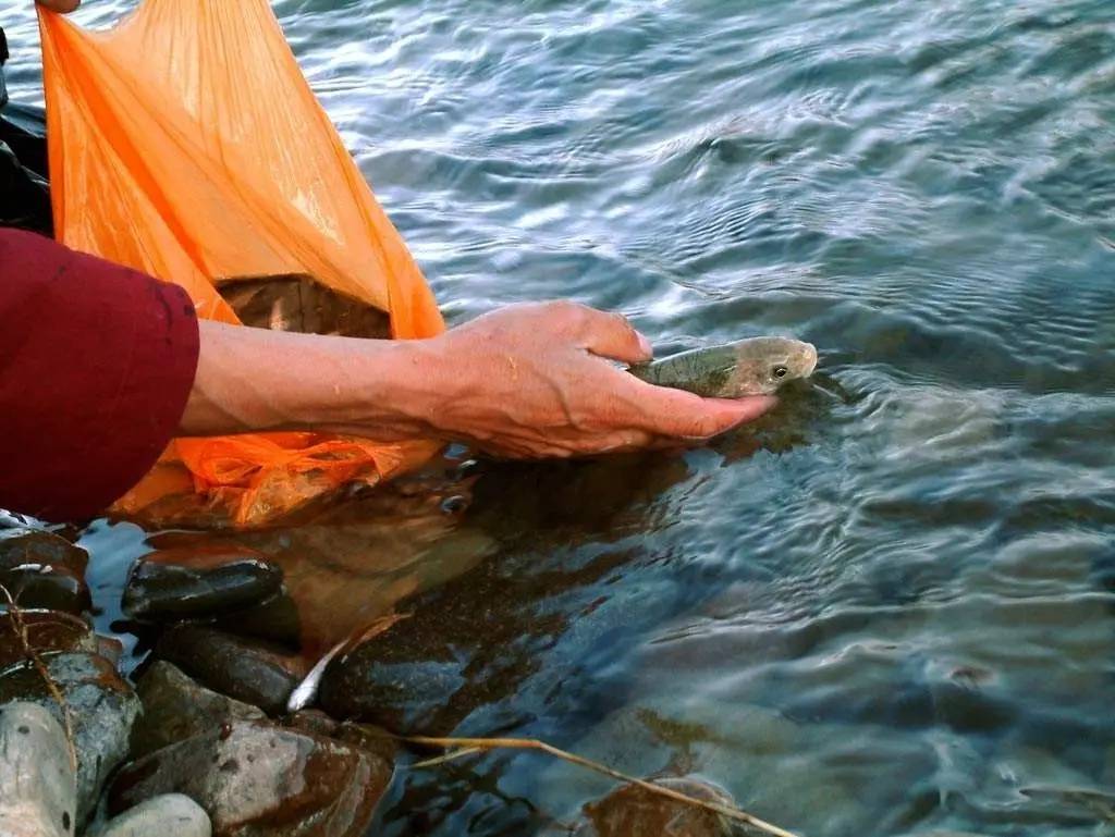 ▍藏族民众在河边放生幼鱼