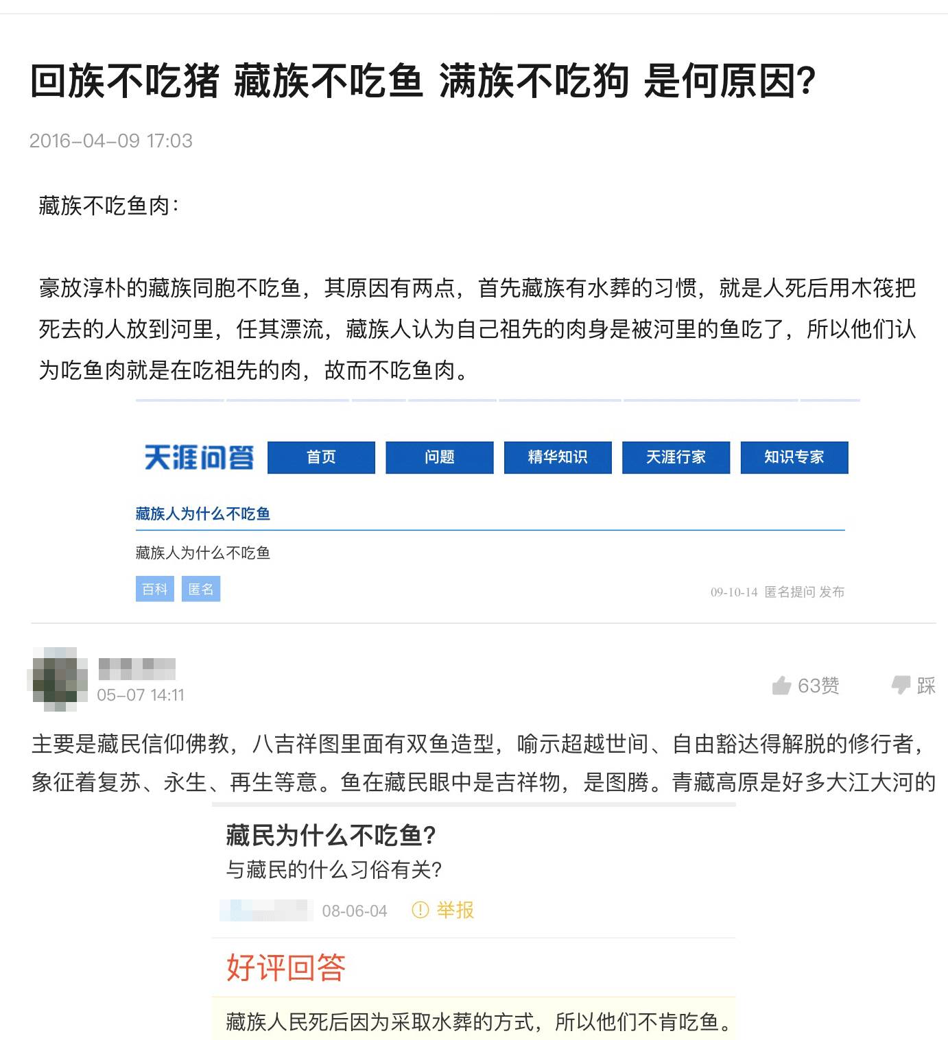 ▍中文网络关于「藏族不吃鱼」的问答