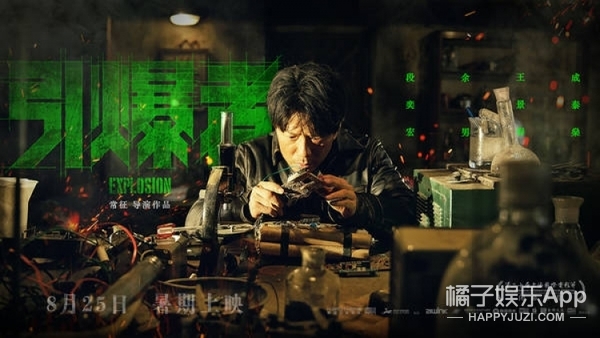 正面海报上,赵旭东正在研究炸弹的引爆器,周围摆放的烧瓶、正在冒火花的电线也让人毛骨悚然想报警。
