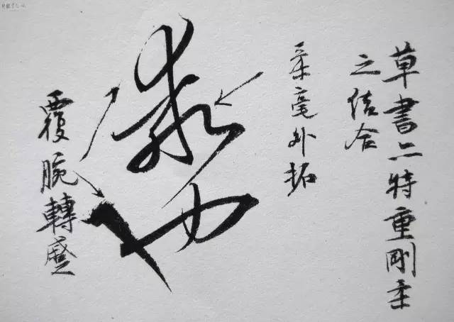 一个画写到中途,需要改变方向,就把笔留驻。此时许多毫毛仍是行来的组合位置,但停住不动了。这时把笔锋方向微微改易,毫毛的位置也随着立即变为微折,在接着写去。