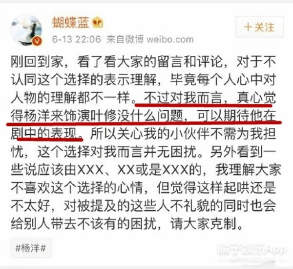 刚官宣的时候,杨洋要扮演电竞大神叶修这事儿还在网上引发了不小的争论。不过后来,原著小说的作者发微博亲自认可了杨洋,粉丝和原著粉之间的争论也就被平息了。
