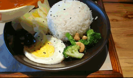 溏心煎鸡蛋,绵软的土豆、清煮的西蓝花、香脆的腰果,配菜也可以很丰富,认真搅拌一分钟,美味的汤汁怎么能轻易放过?