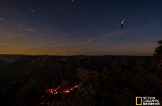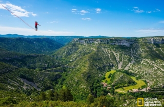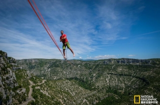 Pablo Signoret正在纳瓦瑟莱山谷上方进行高空行走,破纪录的完成了1662米长的距离。
