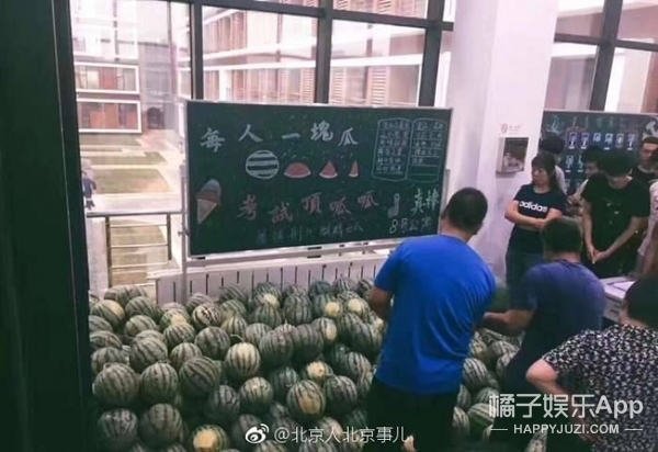 ▼北京某高校给正在准备期末考试的学生送来了大西瓜,黑板上写着“每人一块瓜,考试顶呱呱”,大家都羡慕的称又是别人家的学校。