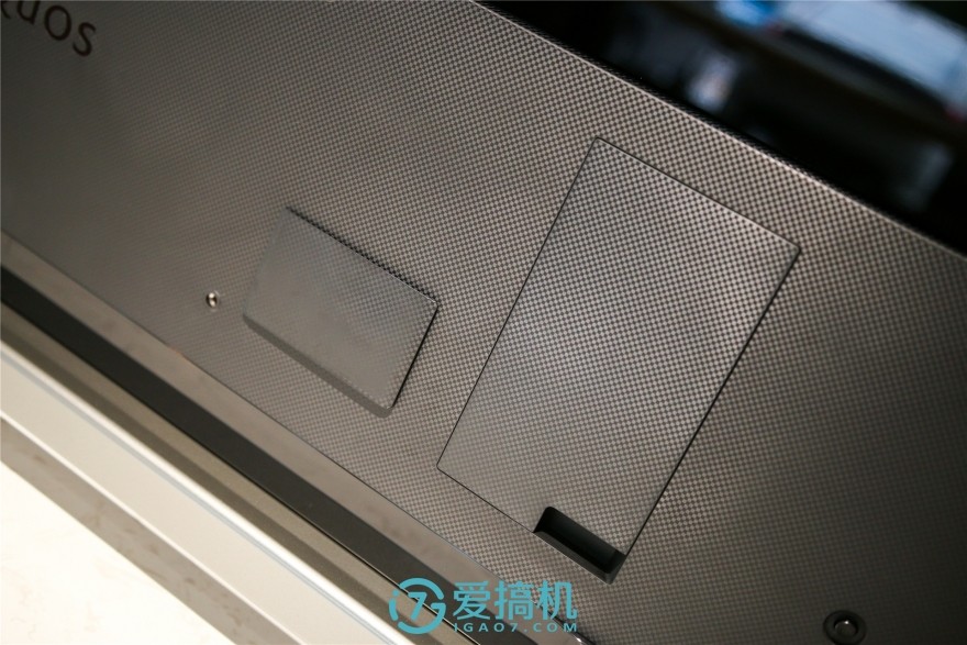 机身背面方面,采用了高光镜面上部+碳纤维纹理底部的分段式设计,机身的主要电路位于下面的弧状碳纤维背板下,机身的所有接口都拥有盖板设计,打开改变连接好线缆后,可以将盖板盖回,以保持机身整体的美观。