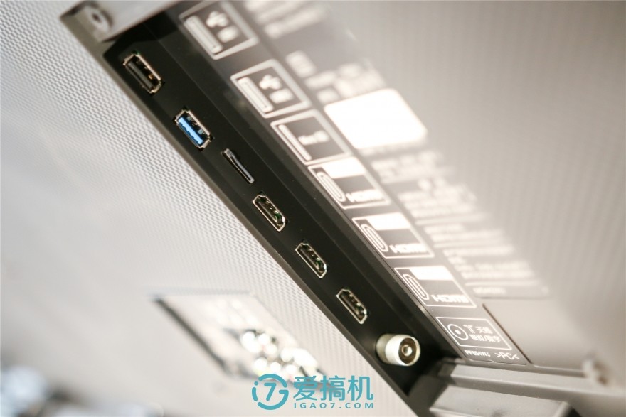 右侧盖板下的接口从上至下依次为USB 2.0、USB 3.0、MicroSD卡、三个HDMI和模拟信号接口。