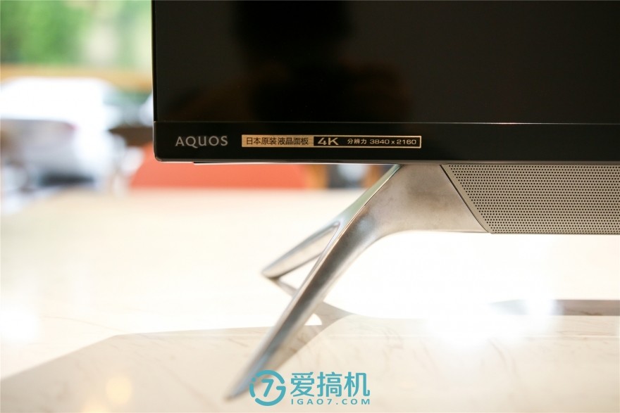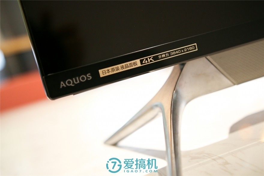 音箱与支架的连接部分,采用了舒缓的过渡设计,支架完全的连接在音箱上,整体性很强,略带弧形的支架也非常具有艺术感。机身的左下角还有一张贴纸,表明了其显示面板是来自夏普自家的日本原装面板。